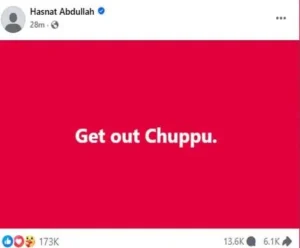 বুধবার (১২ মার্চ) বিকেলে ফেসবুকে দেওয়া সেই স্ট্যাটাসে তিনি ইংরেজিতে মাত্র তিনটি শব্দ লেখেন—“Get out Chuppu।” পোস্টটি প্রকাশের পরপরই সামাজিক যোগাযোগমাধ্যমে ব্যাপকভাবে ছড়িয়ে পড়ে এবং নেটিজেনদের মধ্যে তুমুল আলোচনা শুরু হয়।