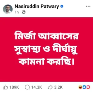 পোস্টে তিনি লিখেছেন, “মির্জা আব্বাসের সুস্বাস্থ্য ও দীর্ঘায়ু কামনা করছি।”